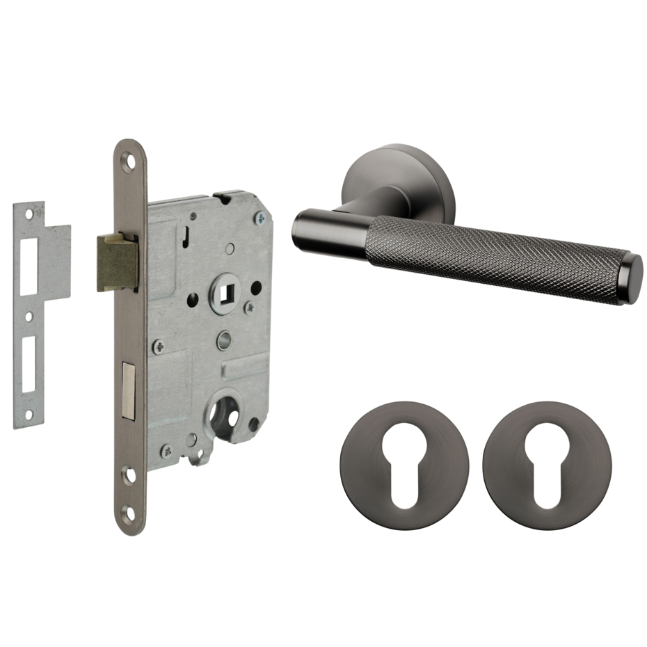 De set bevat antracietgrijze geveerde deurklinken Luxor, cilinderrozetten en een cilinder dag- en nachtslot (PC maat 55 mm). Het strakke, ronde ontwerp met subtiel ruitmotief zorgt voor een stijlvolle afwerking van elke deur.