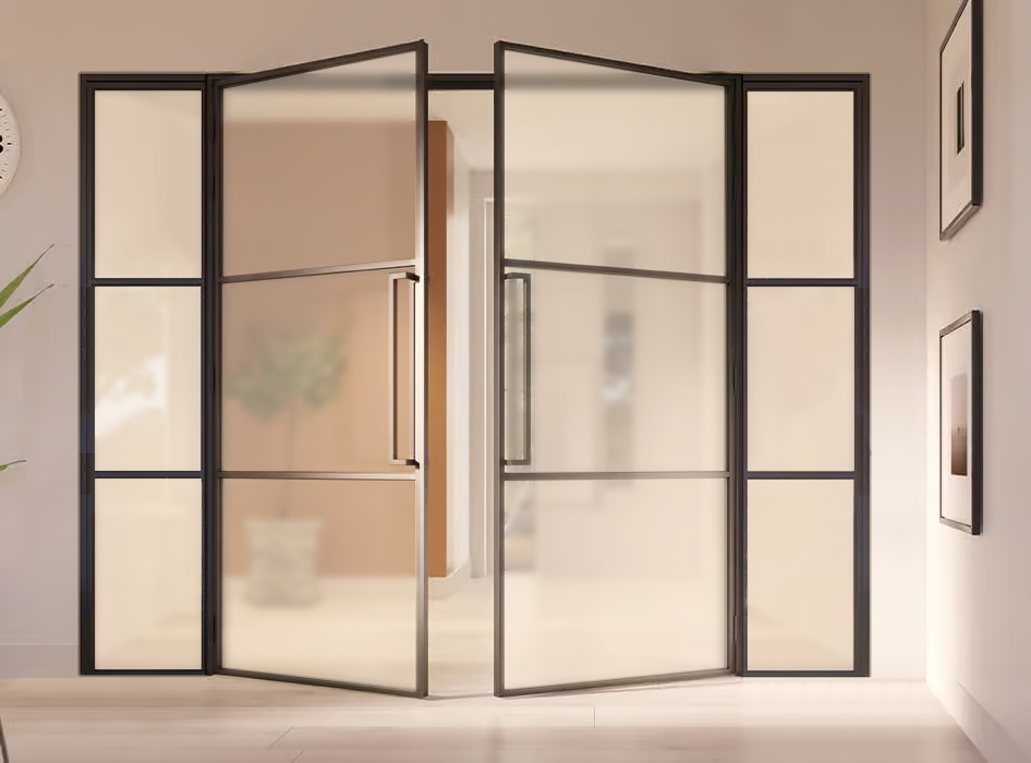 Maatwerk dubbele stalen scharnierdeur met zijlichten Slimline magneetsluiting mat glas (3 vakken)