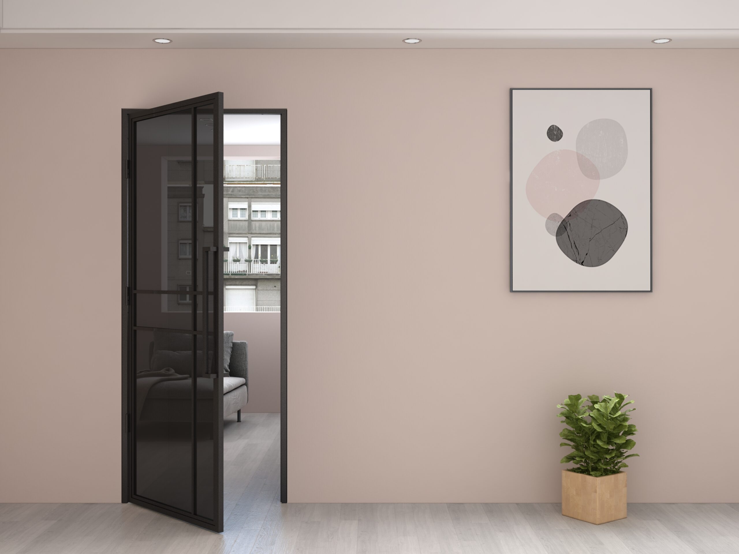 Stalen draaideur (1 mm staal) met veiligheidsglas (4mm), moderne greep en bevestigingsmateriaal.