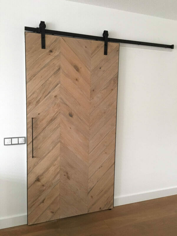 Je kunt een schuifdeur in diverse houtsoorten en ook in verschillende materialen bestellen, de schuifdeur met visgraat of Hongaarse punt is een bijzondere variatie die elke ruimte een compleet ander karakter geeft. We kennen het motief vooral van luxe parket vloeren. Dit bijzondere patroon is erg populair in woningen met een klassiek interieur, deze schuifdeur van Loftdeur komt uitstekend tot zijn recht in zowel een klassieke als in een moderne omgeving. In combinatie met ons zeer degelijke schuifdeursysteem en een elegant doch stevig frame is deze visgraat / Hongaarse punt schuifdeur een kunstwerk aan de wand.